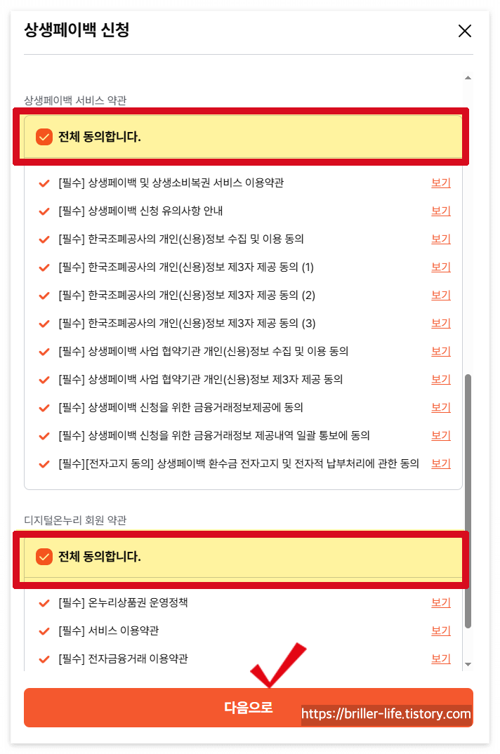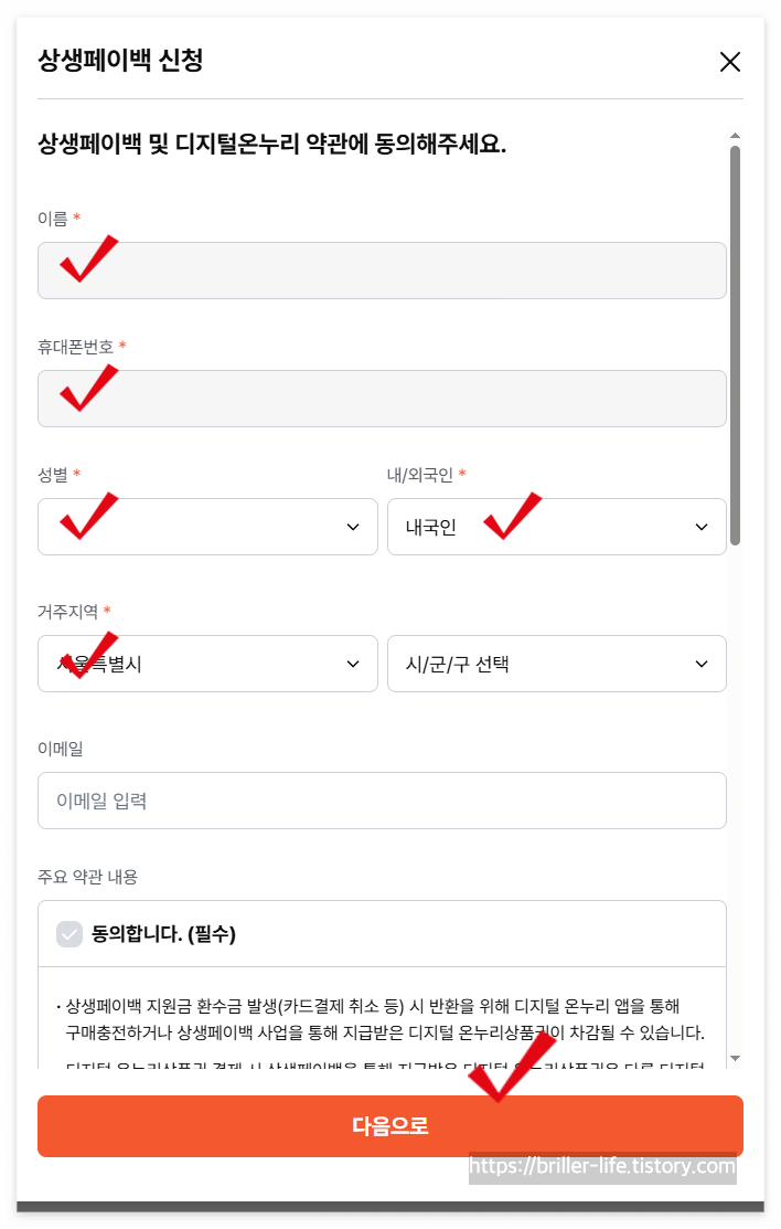 이메일 주소를 적는 칸을 빼고는 모두 필수이니, 본인의 정보를 기입하시고 하단의 주요 약관 내용을 동의한 후 '다음으로' 버튼을 클릭해 줍니다.
